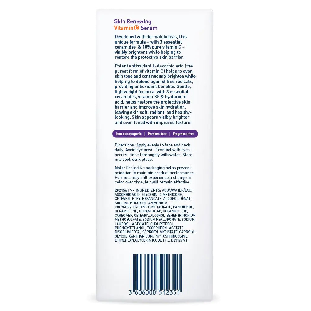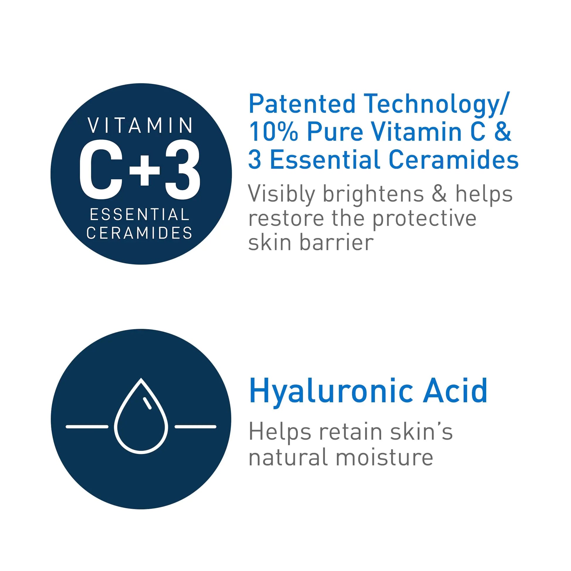 Developed with dermatologists, CeraVe Vitamin C Serum visibly brightens & helps to restore the protective skin barrier. Potent antioxidant L-Ascorbic acid (the purest form of vitamin C) helps to even skin tone & continuously brighten while helping to defend against free radicals & provide antioxidant benefits. Gentle, lightweight formula helps restore the protective skin barrier & improve hydration, leaving skin soft, radiant, & healthy- looking.Paraben-FreeFragrance-FreeNon-ComedogenicKey Ingredients:10% Pure Vitamin C: Formulated with 10% l-ascorbic acid, this formula helps visibly brighten and provide antioxidant benefits.Ceramides: Essential for healthy skin, ceramides help restore and maintain the skin’s natural barrierHyaluronic Acid: This ingredient attracts hydration to the skin’s surface and helps the skin retain moisture